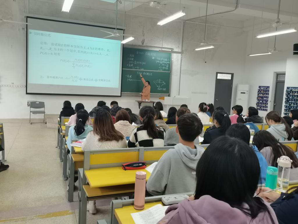 任丹丹老师本节课主讲全概率公式和贝叶斯公式,她先从当前的时事热点入手,由新冠疫情感染的概率引入,把晦涩难懂的公式融入到现实生活中,再找出全概率公式和贝叶斯公式的联系和区别,指出这两个重要公式本质上的区别和联系。最后再引导到现实生活中,深入浅出地自然引入了全概率公式及其简单证明,并结合典型例题简单通俗地讲解了如何运用贝叶斯公式解决实际问题。最后,任丹丹老师总结指出这两个重要公式所蕴含的整体与部分、特殊与一般之间的辩证关系。教学过程中,任丹丹老师重难点突出,板书严谨规范,师生积极互动,课堂气氛活跃。青年教师表示深受启发,在课堂教学组织和管理方面收获颇丰。