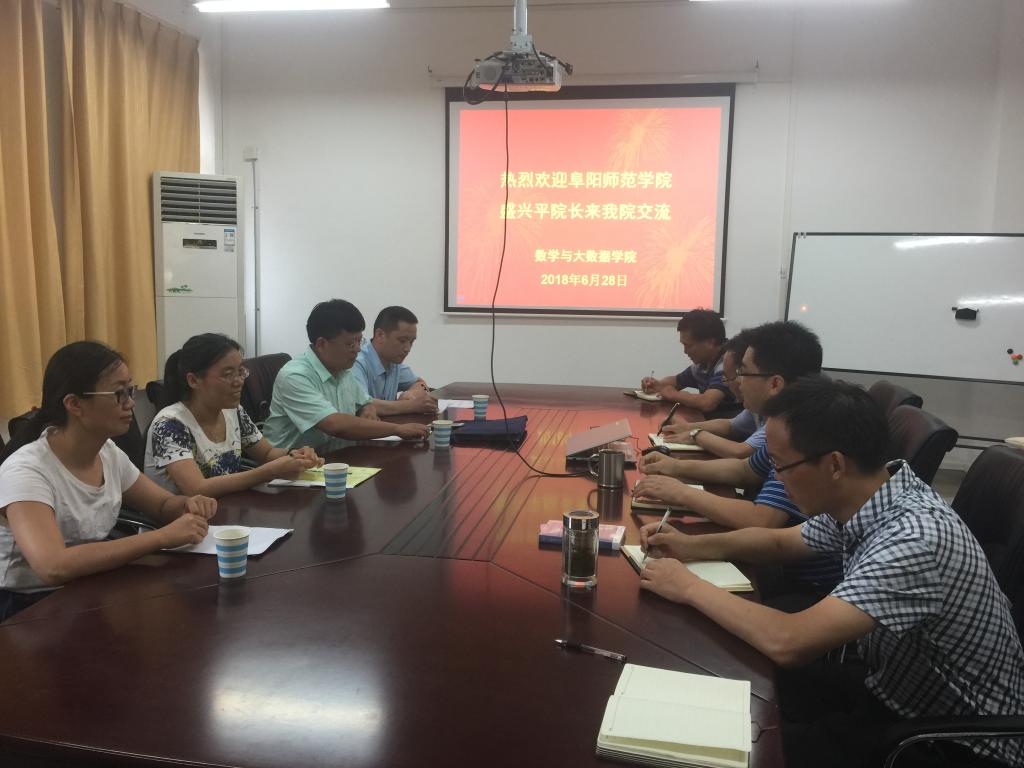 6月28日下午,阜阳师范学院数学与统计学院院长盛兴平等一行4人来ok138太阳集团就研究生联合培养开展交流,院领导、部分导师及联合培养研究生参加了此次交流会,方贤文院长主持会议。