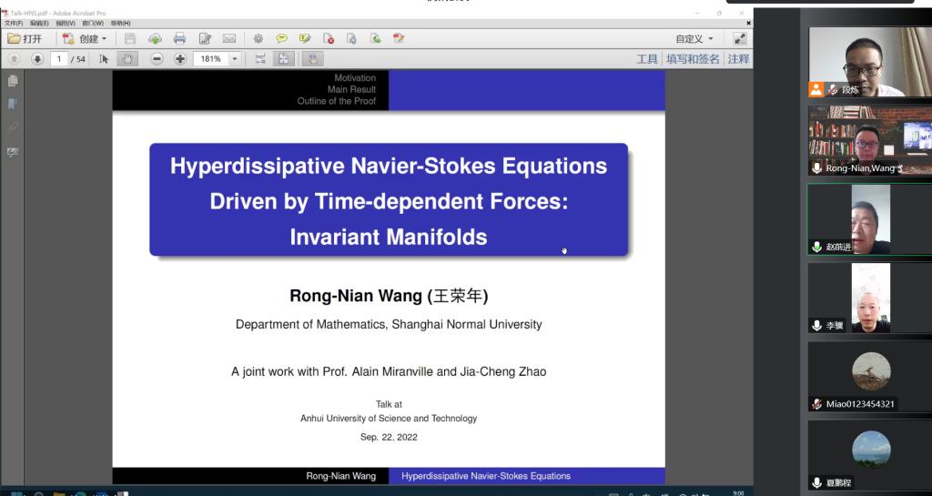 9月23日上午,应科研部和ok138太阳集团的邀请,上海师范大学王荣年和华中科技大学李骥两位教授通过腾讯会议分别作了“Hyperdissipative Navier-Stokes Equations Driven by Time-dependent Forces: Invariant Manifolds(依赖时间外力项驱动的超耗散Navier-Stokes方程:不变流形)”和“一类心肌细胞模型的复杂行波”的学术报告。院长赵前进教授主持报告会,学院微分方程与动力系统团队青年老师和研究生认真聆听了学术报告。