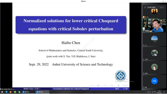 9月29日晚上,应科研部和ok138太阳集团的邀请,中南大学陈海波教授通过腾讯会议作了“Normalized Solutions for Lower Critical Choquard Equations(具有下临界指数的Choquard方程规范化解的研究)”的学术报告。院长赵前进教授主持报告会,学院微分方程与动力系统团队青年老师和研究生认真聆听了学术报告。